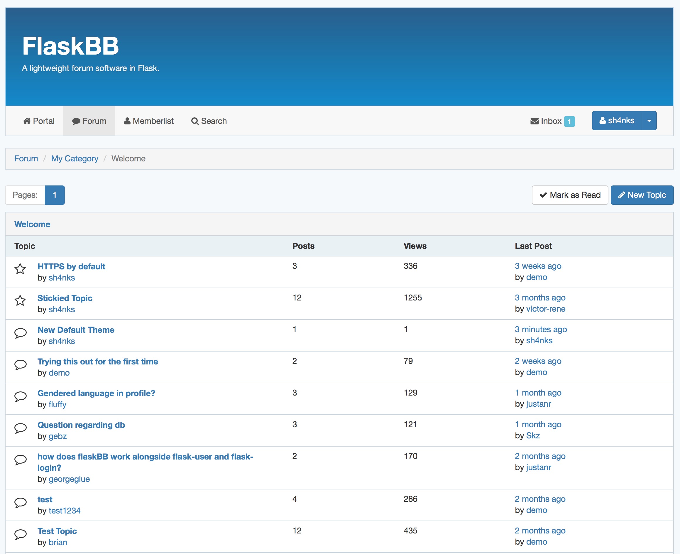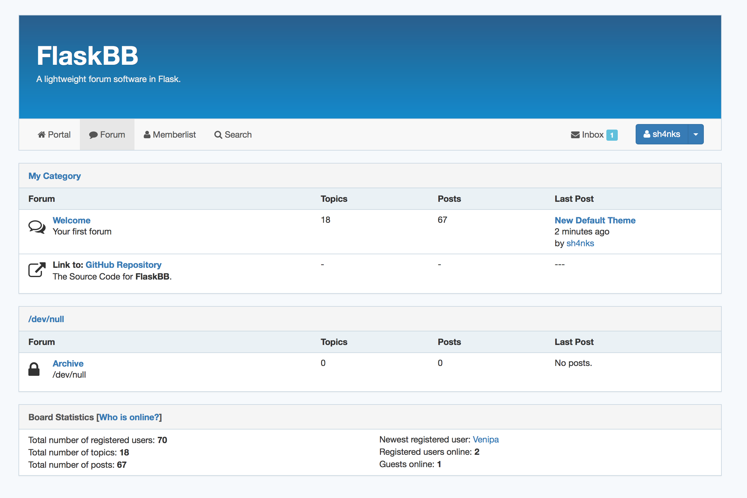 FlaskBB is open source and the whole source code is available on GitHub. It is being developed under the BSD 3-Clause license.